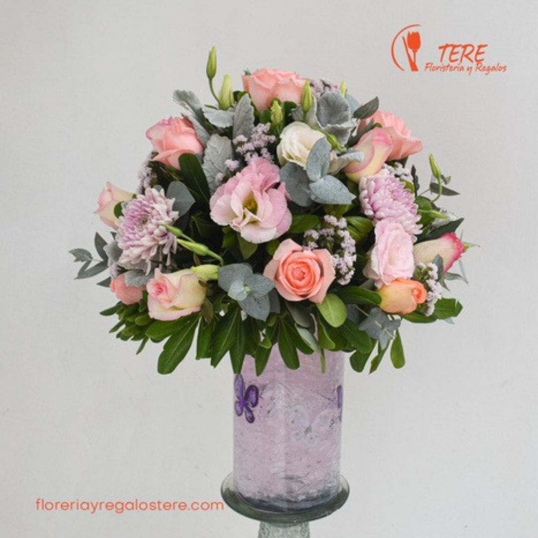 Hermoso bouquet en base de cristal, rosas, lisiantus y follajes finos