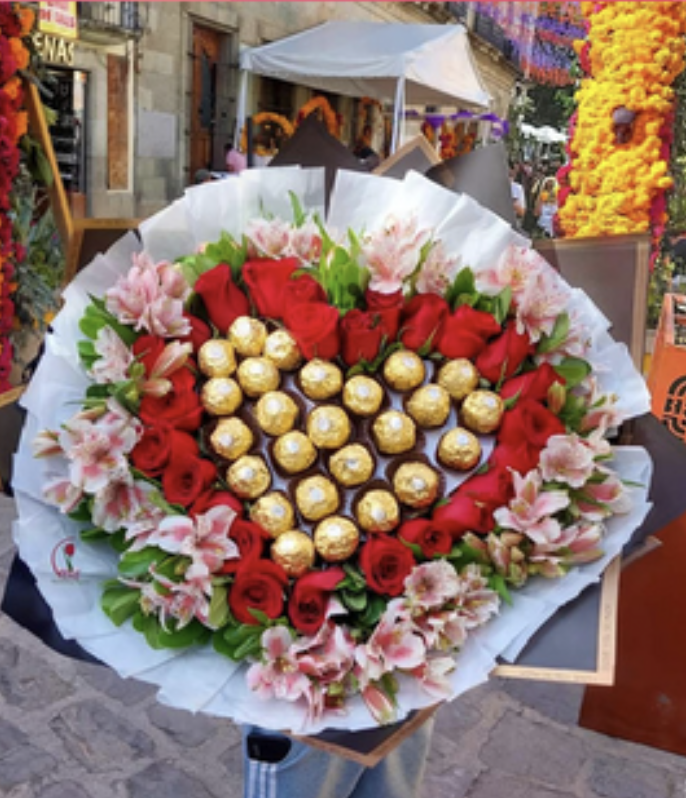 Hermoso ramo en forma de corazón con rosas y chocolates.