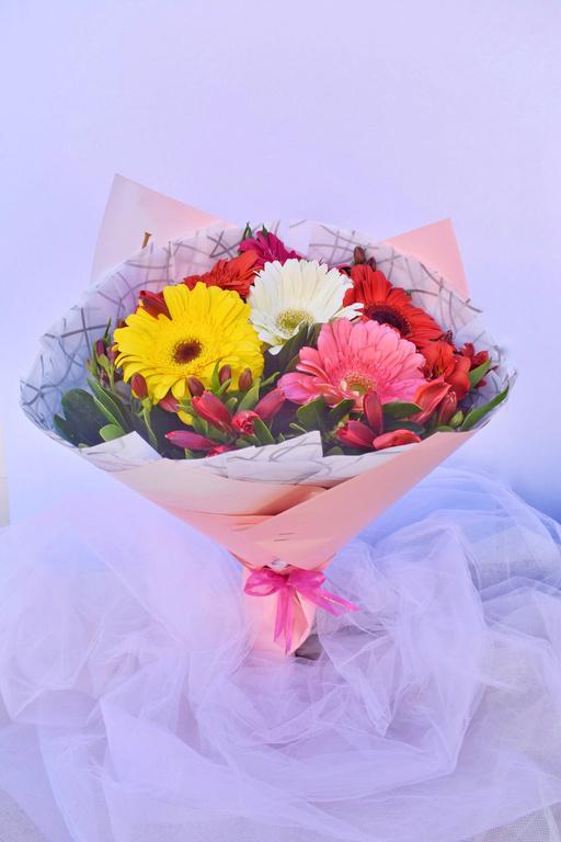 Media docena de gerberas acompañado de flores de temporada