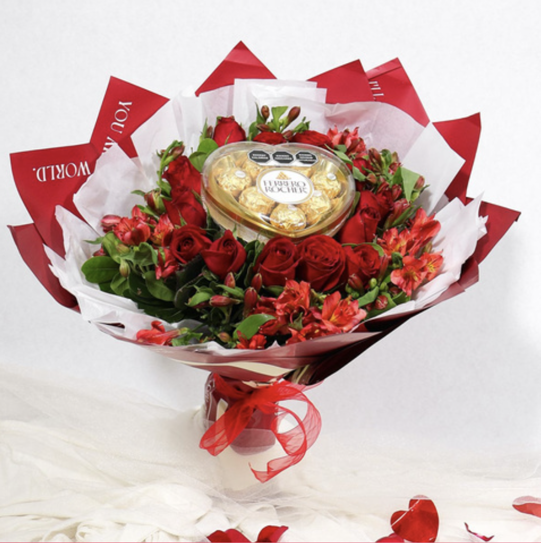 Hermoso ramo en forma de corazón de rosas y caja de chocolates en forma de corazón